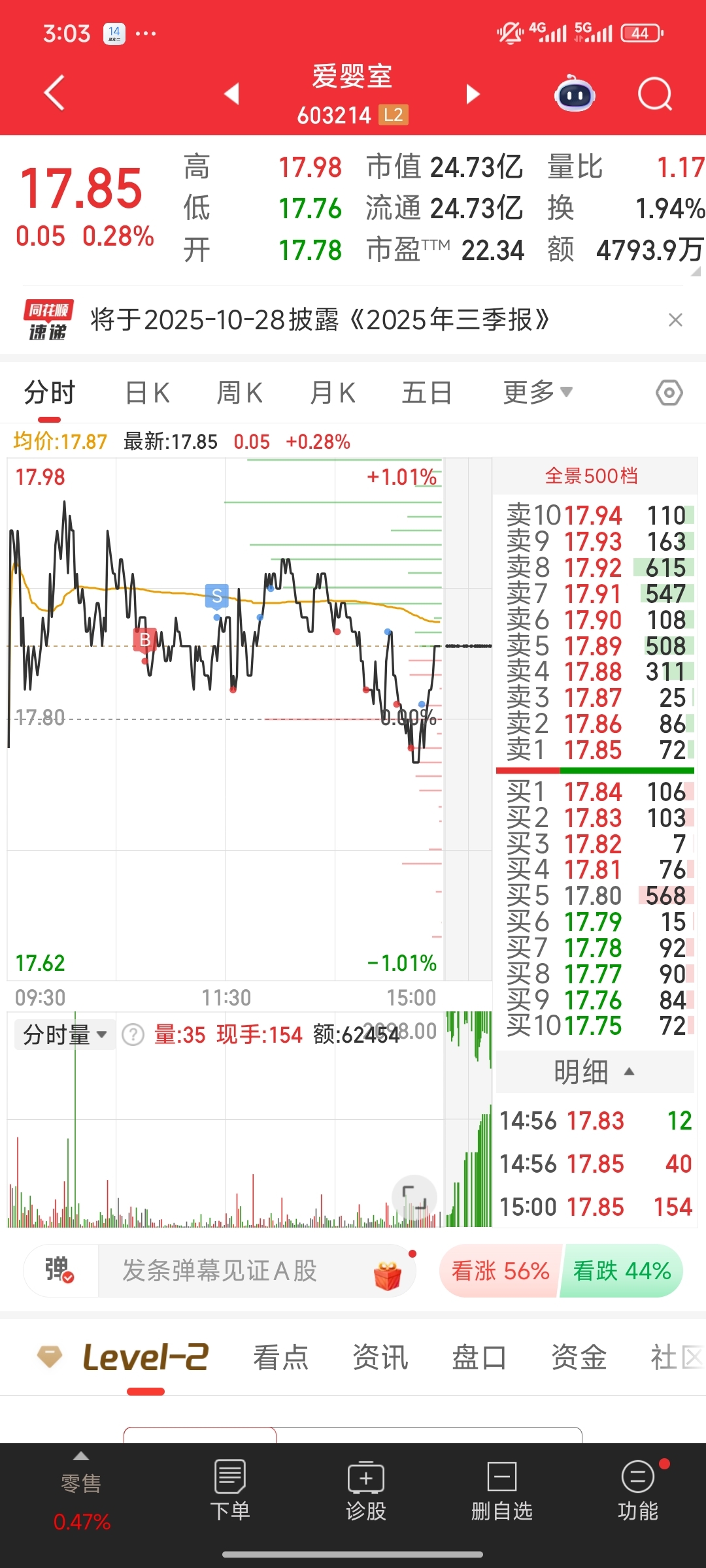 $爱婴室(SH603214)$ 喜欢尾盘偷袭?看明天是我砸的猛,还是你拉的快(早盘再另外一个账户,懒得换了)没错就是我砸的