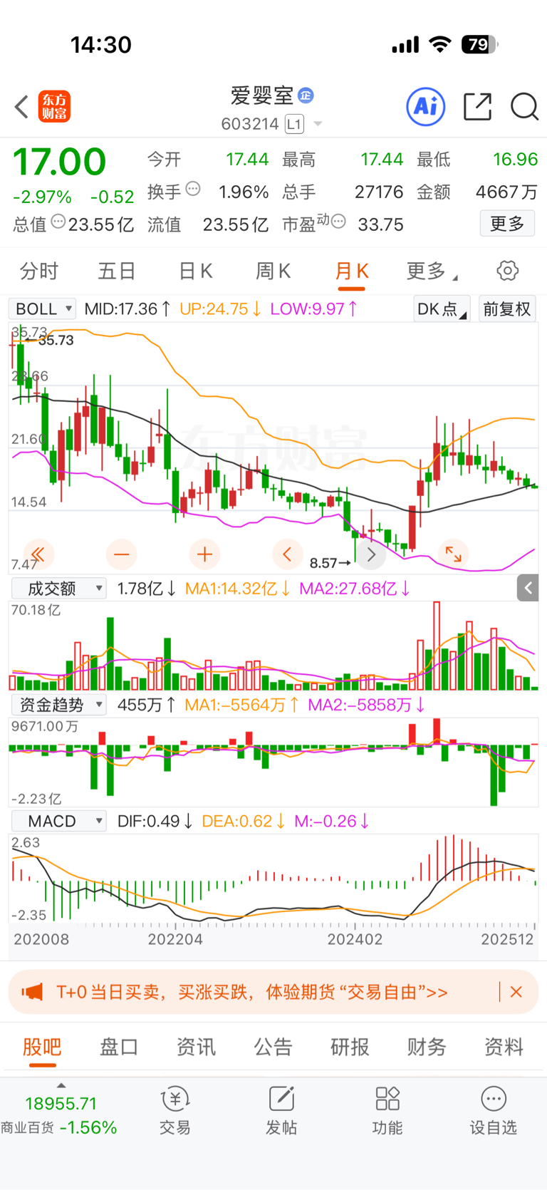 $爱婴室(SH603214)$ 月K boll下轨才是买点