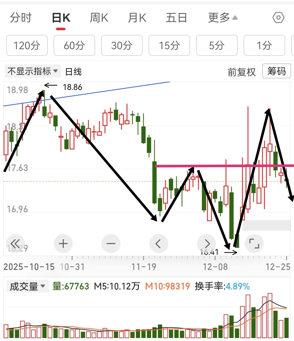 他这里就是日线1笔反平台后,的1笔回踩,明天再破一破17.34结构就满足了。不破