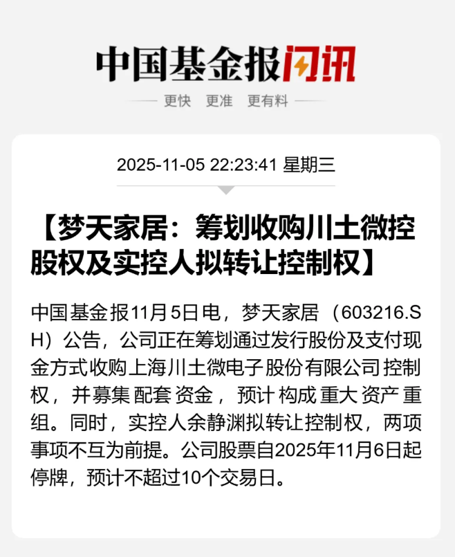 梦天家居11月5日晚公告,公司正在筹划通过发行股份及支付现金的方式收购上海川土微电子股份有限公司(以下简称川土微)控制权,并募集配套资金;公司股票自2025年11月6日(星期四)开市起停牌,预计停牌时间不超过10个交易日。