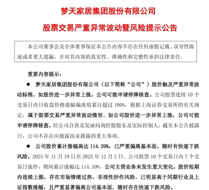 12月2日,梦天家居(603216.SH,股价33.66元,市值74.96亿元)公告称,公司股票连续10个交易日内日收盘价格涨幅偏离值累计超过100%,根据上海证券交易所的有关规定,属于股票交易严重异常波动情形。如公司股价进一步异常上涨,公司可能申请停牌核查。经公司自查及发函问询控股股东及实际控制人,截至本公告披露日,公司不存在应披露而未披露的重大事项。