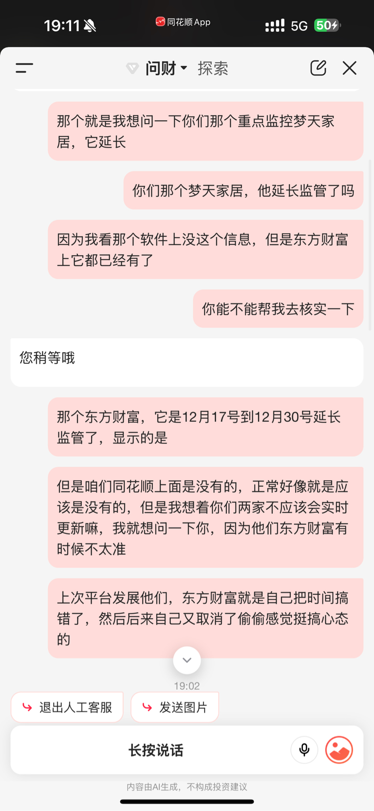 同花顺是没有显示的,东方财富有时候显示是有问题的,上次平潭发展也是显示多一天,但是第二天盘中就没有了,这次梦天基本上就没有触发异常波动,所以很可能是东方财富自己误判了,大家不用恐慌,我已经问过工作人员了,他说现在监管的都是触发异常波动的,但是梦天并没有触发异常波动