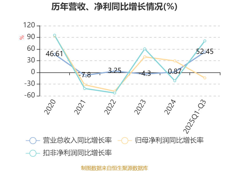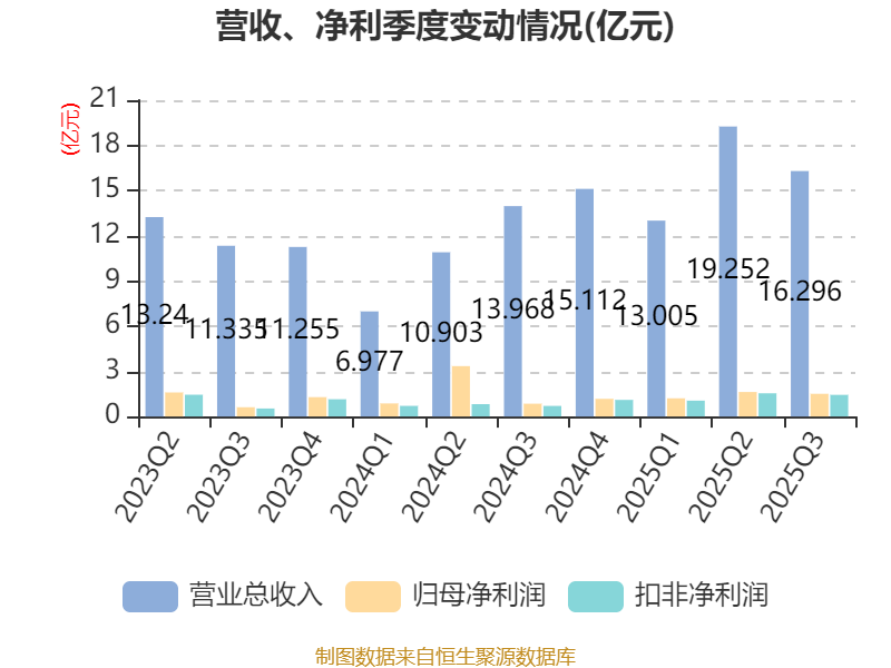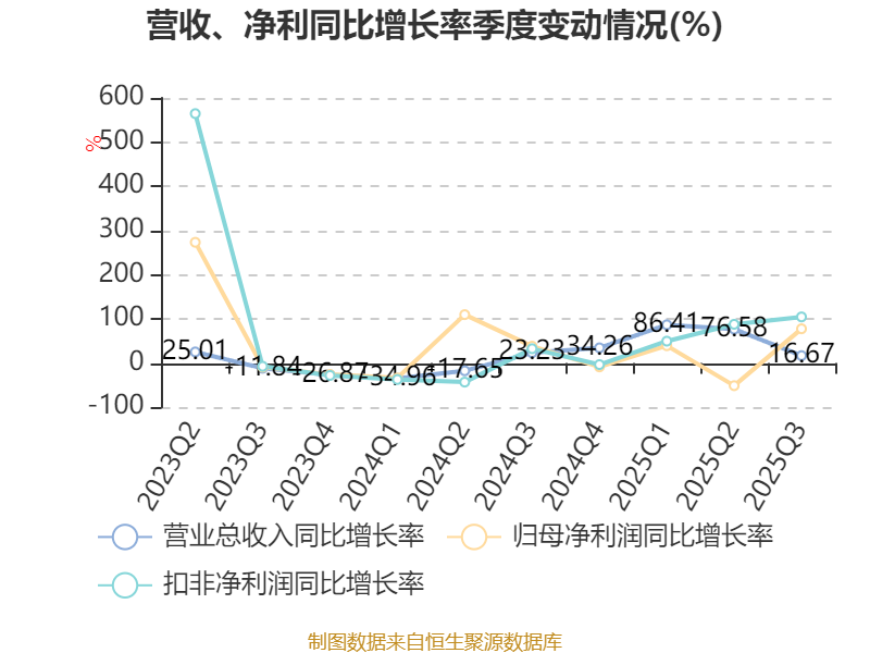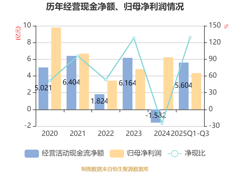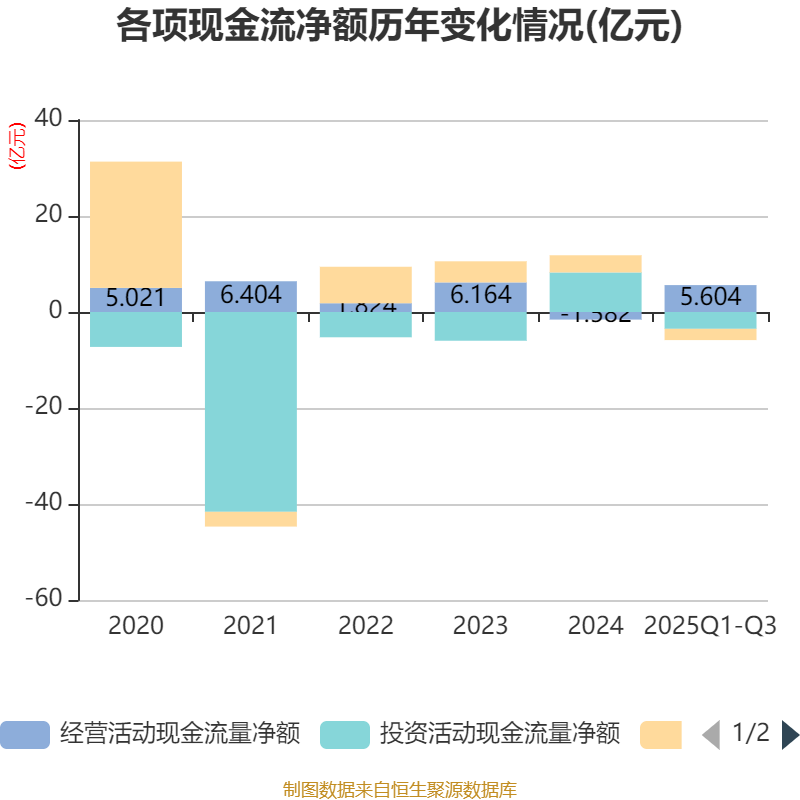 2025年前三季度,公司经营活动现金流净额为5.6亿元,同比增加8.53亿元;筹资活动现金流净额-2.35亿元,同比减少2.03亿元;投资活动现金流净额-3.51亿元,上年同期为2.61亿元。