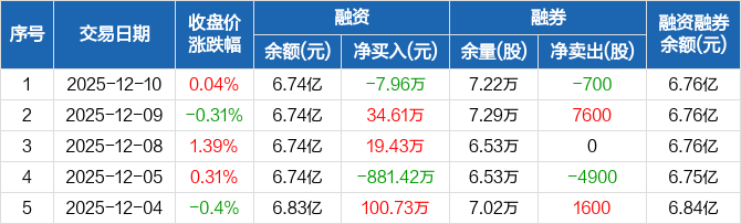 中贝通信:融资净偿还7.96万元,融资余额6.74亿元(12-10)