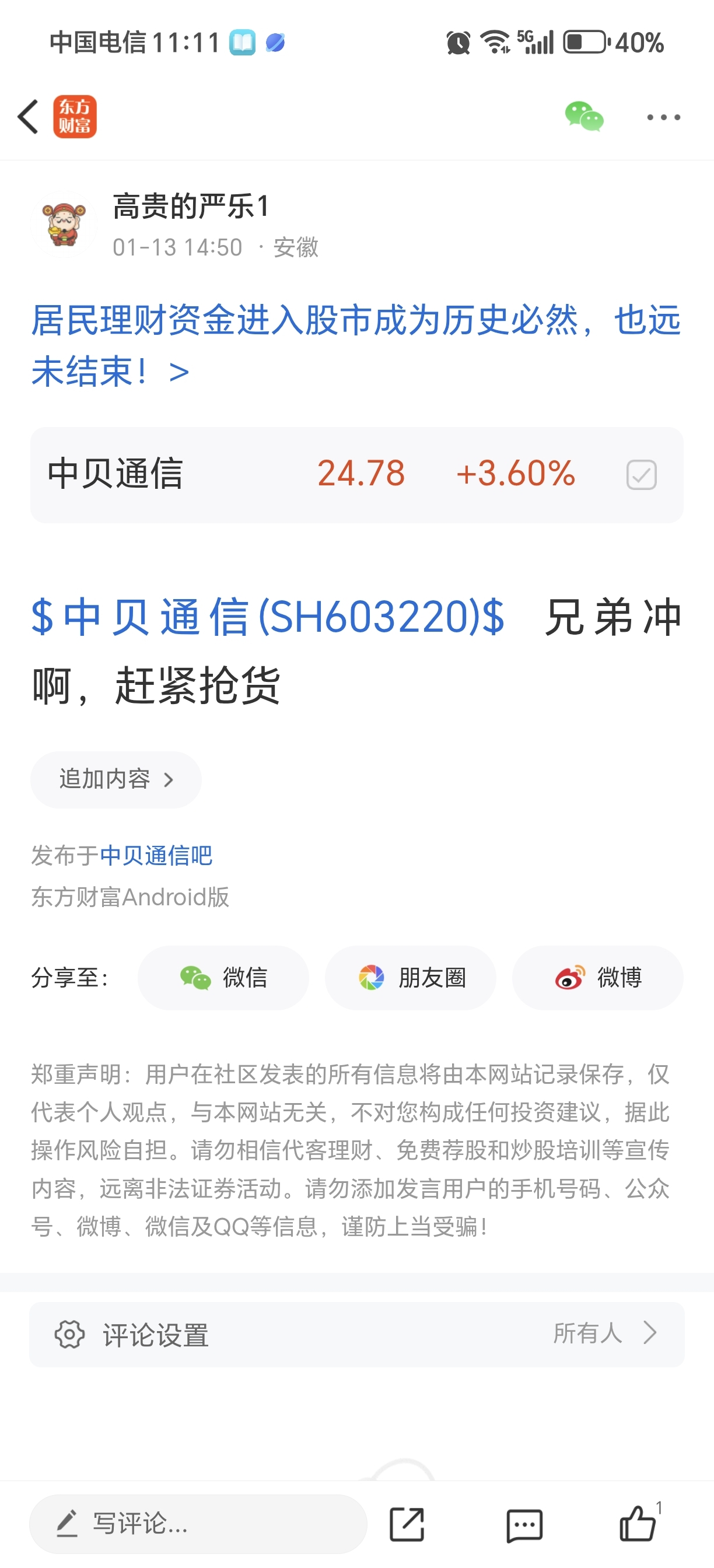温馨提示: 1.根据《证券法》规定,禁止编造、传播虚假信息或者误导性信息,扰乱证券市场;2.用户在本社区发表的所有资料、言论等仅代表个人观点,与本网站立场无关,不对您构成任何投资建议。用户应基于自己的独立判断,自行决定证券投资并承担相应风险。《东方财富社区管理规定》