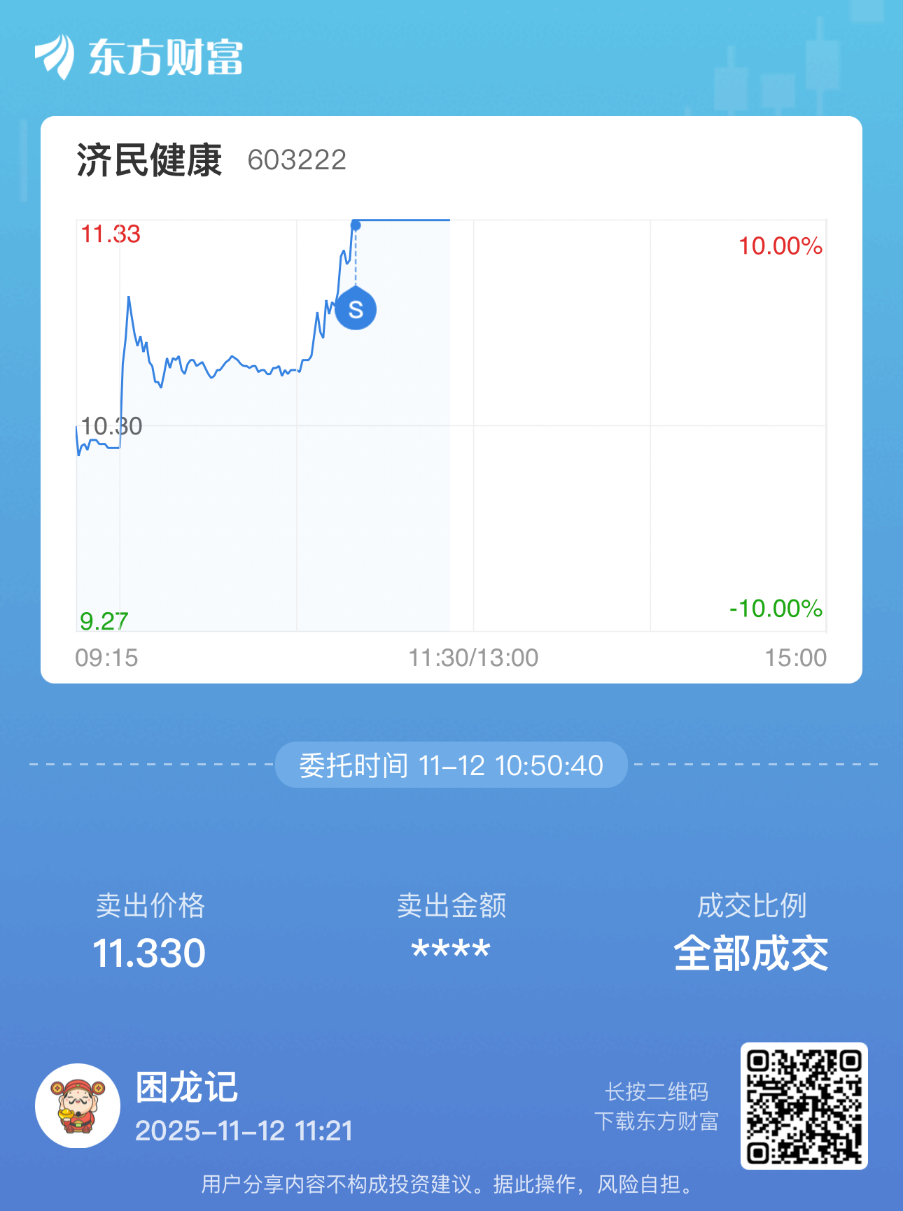 $济民健康(SH603222)$ 祝发财 回头再见