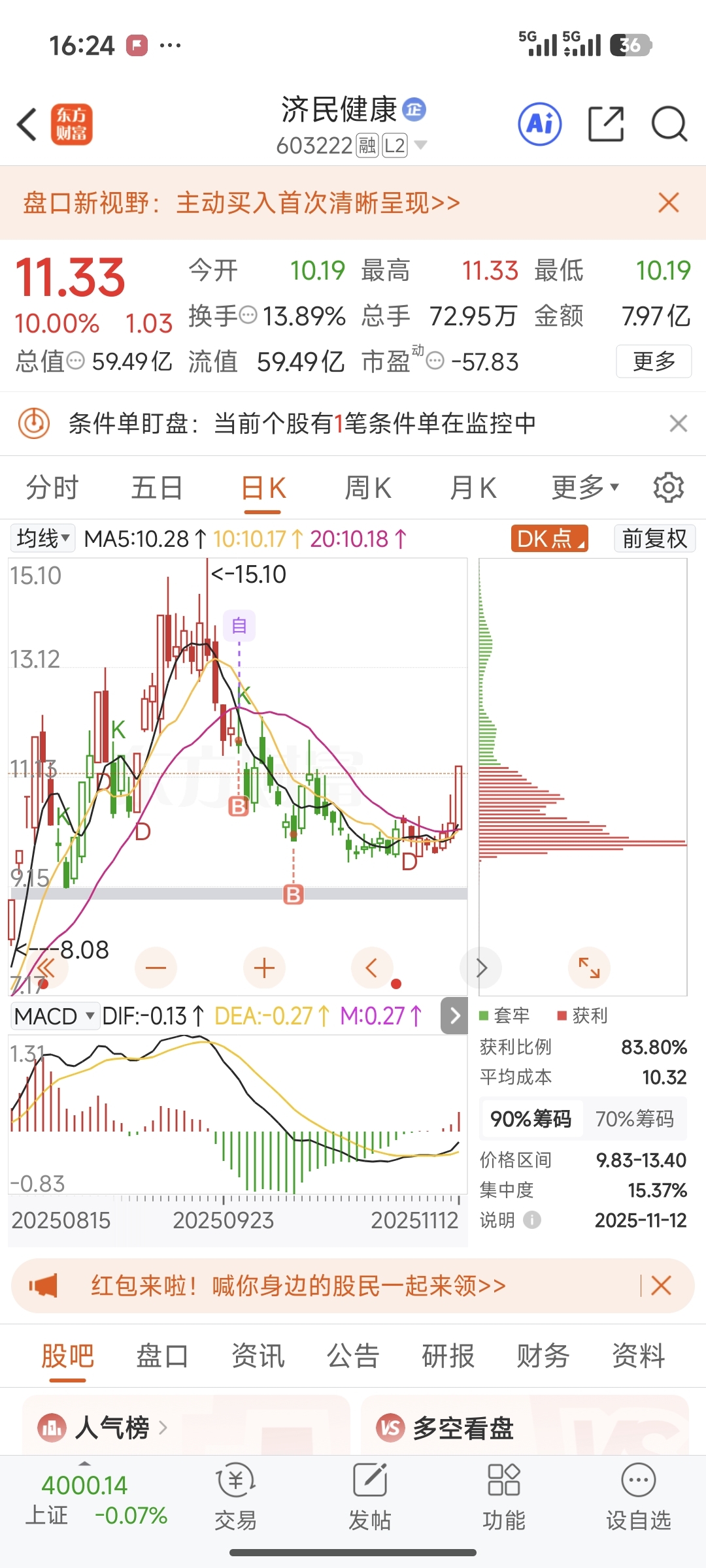 $济民健康(SH603222)$ 大佬们应该走不?回本了