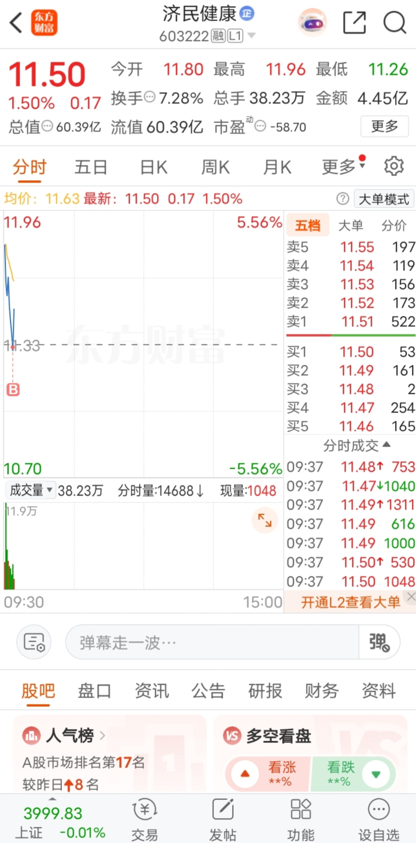 早盘选择水下低吸介入了个股$济民健康(SH603222)$