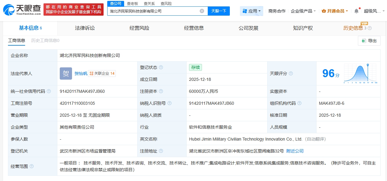 南方财经12月22日电,天眼查工商信息显示,近日,湖北济民军民科技创新有限公司成立,法定代表人为贺怡帆,注册资本6亿人民币,经营范围包括集成电路设计、软件开发、信息系统集成服务、信息技术咨询服务等。股东信息显示,该公司由济民健康(603222)全资持股。