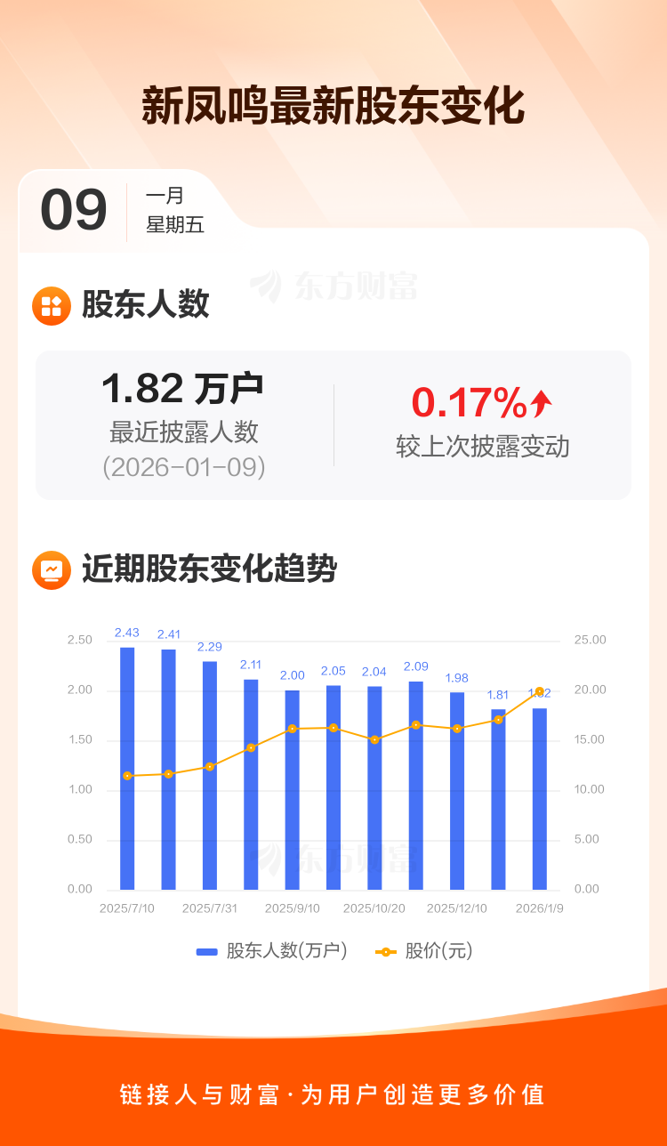 新凤鸣最新披露数据显示,截至1月9日公司股东户数为1.82万户,较上期(2025年12月19日)增加31户,增幅为0.17%。户均持有流通股数量由上期的8.36万股下降至8.34万股,户均持股金额由上期的142.48万元增加至166.18万元。