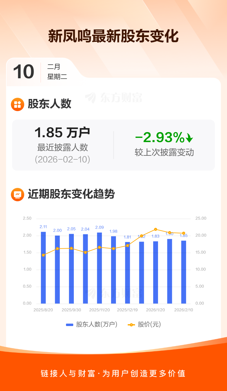 新凤鸣最新披露数据显示,截至2月10日公司股东户数为1.85万户,较上期(2026年1月30日)减少558户,降幅为2.93%。户均持有流通股数量由上期的7.98万股上升至8.30万股,户均持股金额由上期的166.49万元增加至171.79万元。