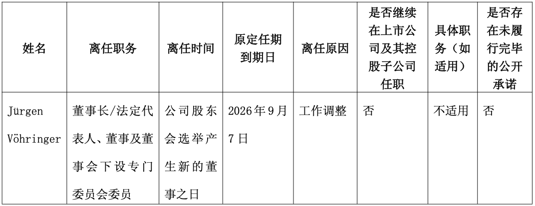 因工作调整,Jurgen Vohringer申请辞去公司董事长/法定代表人、董事及董事会下设专门委员会委员职务,辞职后将不在公司担任任何职务。