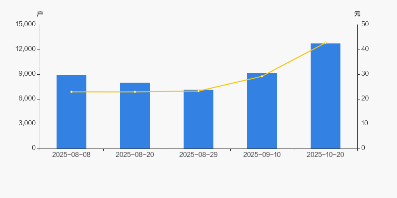 2025年8月8日至今,公司股东户数显著增长,区间涨幅为43.41%。2025年8月8日至2025年10月20日区间股价上涨86.46%。