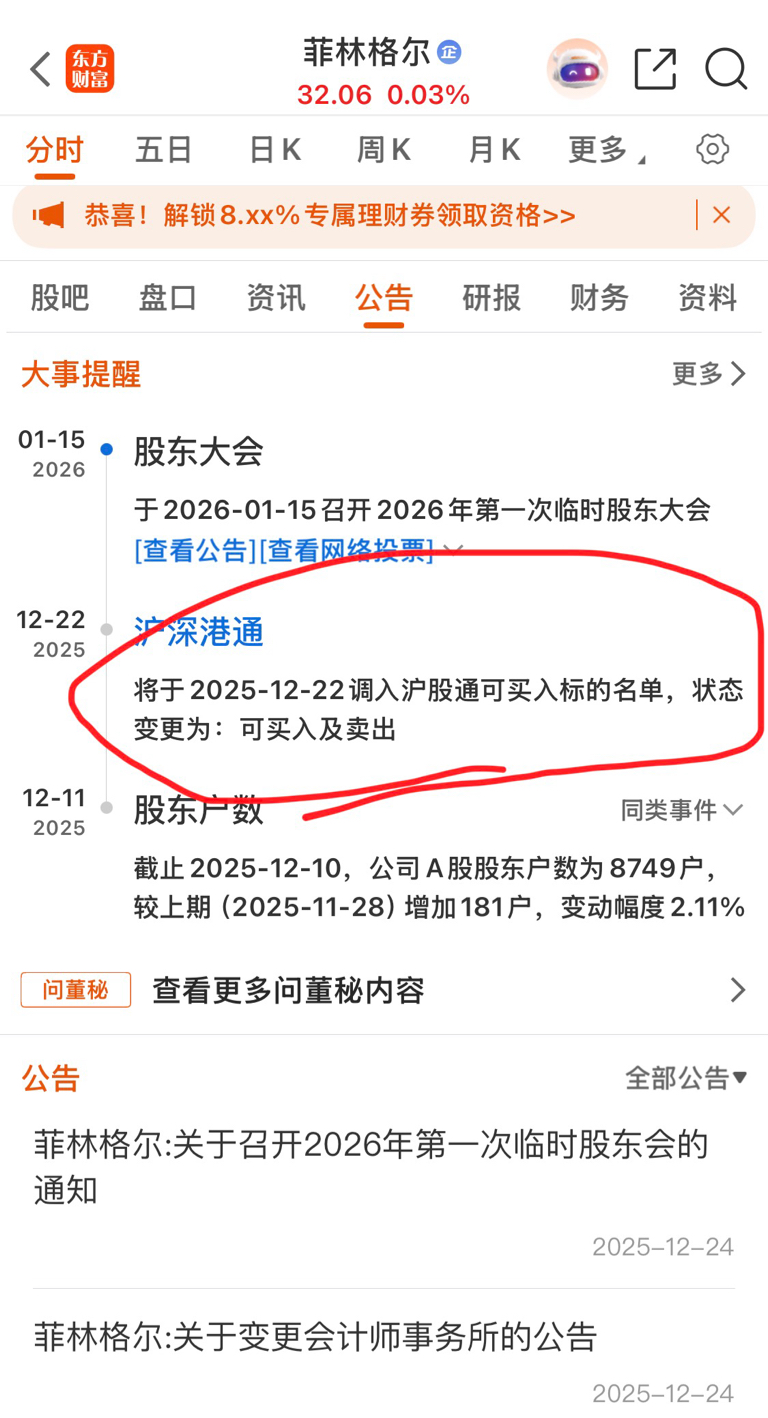 $菲林格尔(SH603226)$ 12月22日调入沪股通!