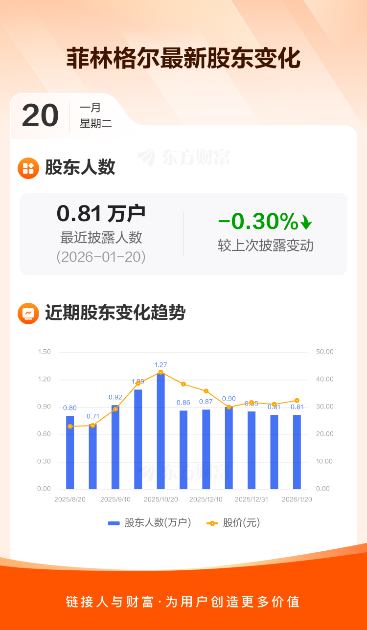 菲林格尔最新披露数据显示,截至1月20日公司股东户数为8095户,较上期(2026年1月9日)减少24户,降幅为0.30%。户均持有流通股数量由上期的4.38万股上升至4.39万股,户均持股金额由上期的135.56万元增加至142.20万元。