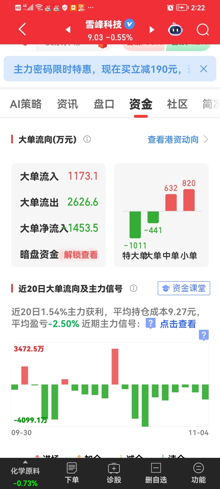 $雪峰科技(SH603227)$ 显示主力成本9.27,股价若明日破8.97,便往下探底,到砸出恐慌盘横盘放量往上,便是静侍低吸机会。股市宁可空仓,也不买换手不连续放大股,因进去便难出来,亏了也得出来观察观察!大把股可选,何必吊死在一颗树上。
