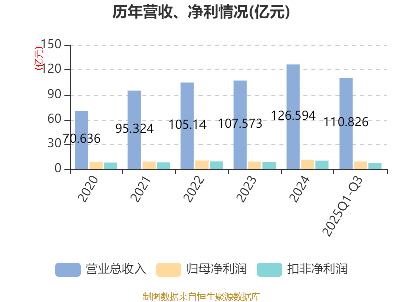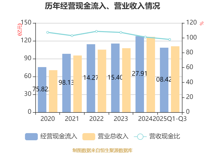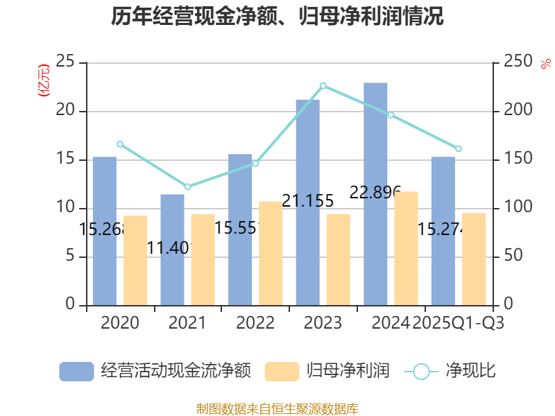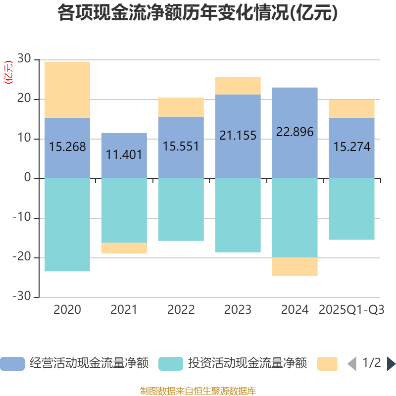 2025年前三季度,公司经营活动现金流净额为15.27亿元,同比下降18.65%;筹资活动现金流净额4.47亿元,同比增加7.67亿元;投资活动现金流净额-15.53亿元,上年同期为-15.78亿元。