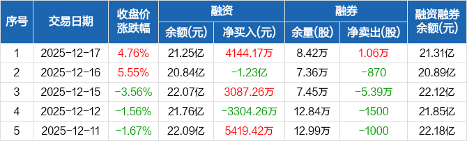 融资方面,当日融资买入3.83亿元,融资偿还3.42亿元,融资净买入4144.17万元。融券方面,融券卖出1.36万股,融券偿还3000股,融券余量8.42万股,融券余额605.4万元。融资融券余额合计21.31亿元。