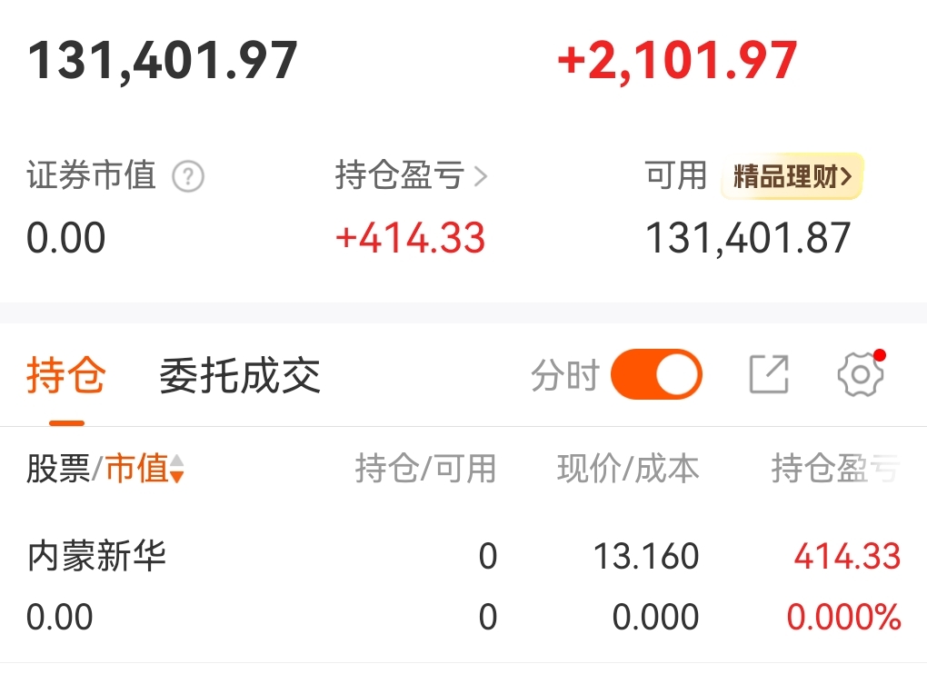 12月23号13.10买的100手,一个多月错过了大牛市,今天又是放量滞涨,实在受不了,13.15卖了,扣除手续费,含泪赚了四百块钱。拉黑这只股。