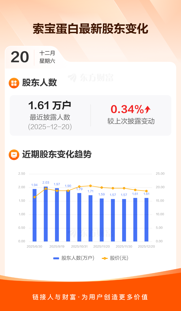 索宝蛋白:截至12月20日最新股东户数1.61万户,较上期增加0.34%
