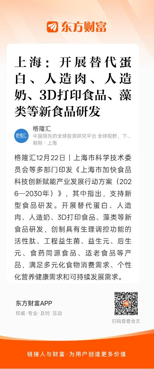 格隆汇12月22日|上海市科学技术委员会等多部门印发《上海市加快食品科技创新赋能产业发展行动方案(2026—2030年)》,其中指出,支持新型食品研发。开展替代蛋白、人造肉、人造奶、3D打印食品、藻类等新食品研发,创制具有生理调控功能的活性肽、工程益生菌、益生元、后生元、食药同源食品、适老食品等产品,满足多元化食物消费需求、个性化营养健康需求和可持续发展需求。