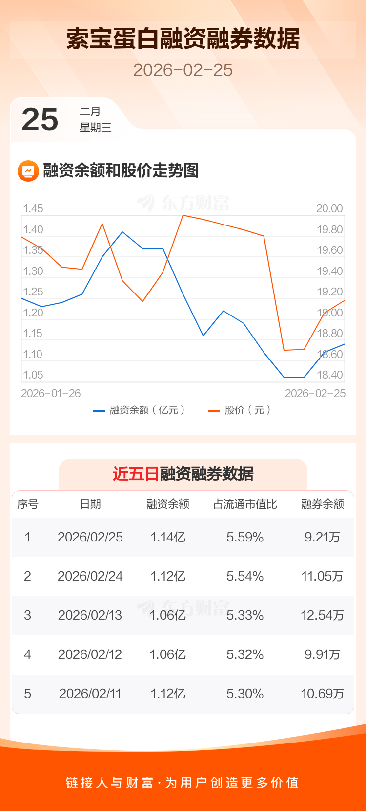 交易所最新数据显示,索宝蛋白于2026年2月25日获融资买入745.14万元,融资偿还571.34万元,当日融资净买入173.81万元。目前,该股融资余额1.14亿,占流通市值比例为5.59%。