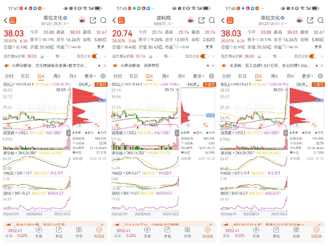 现在我再来聊聊几个做反包预期的标的,也都是在没有有效跌破上轨时板块强度还在,然后直接反包或再度走强!像荣信文化,建科院,天健集团,