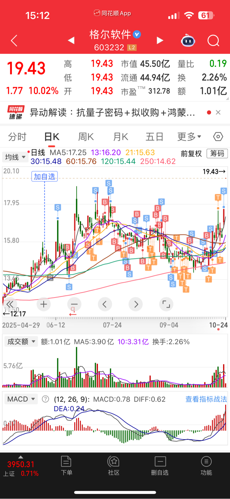 $格尔软件(SH603232)$ 自6/9日建仓以来,一直在里面反复操 来回操,已操出感情,这两天太猛了不给机会操不动了