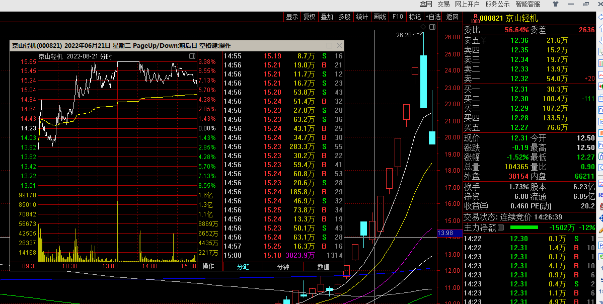完了,明天要低开拉连板了,参考京山轻机2022年6月21日下午借大盘跳水砸烂封板