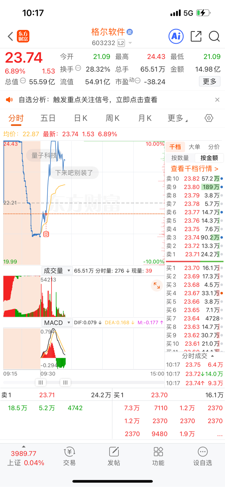 $格尔软件(SH603232)$ 满仓进,希望今天收盘正五,明天弱转强