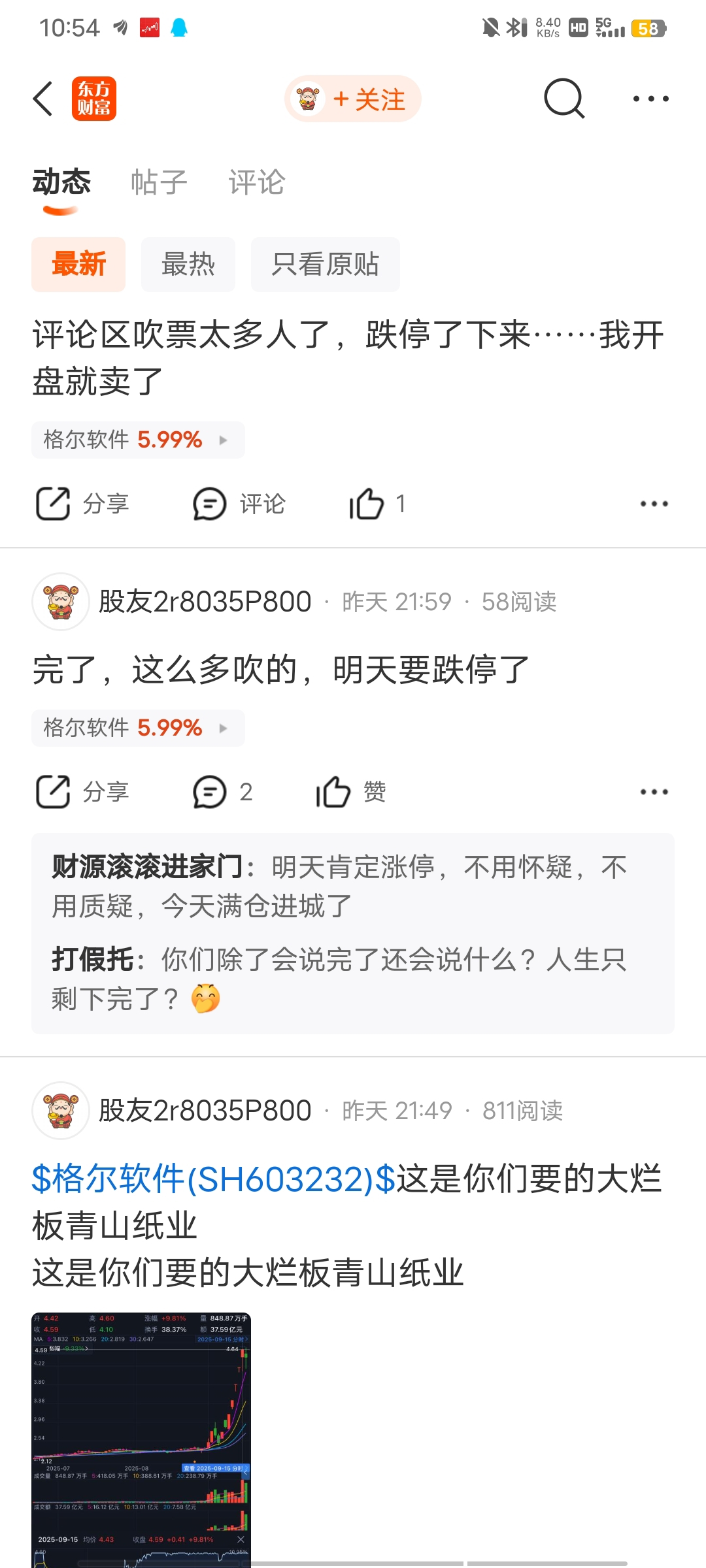 $格尔软件(SH603232)$ 这人昨天一直吹着说跌停
