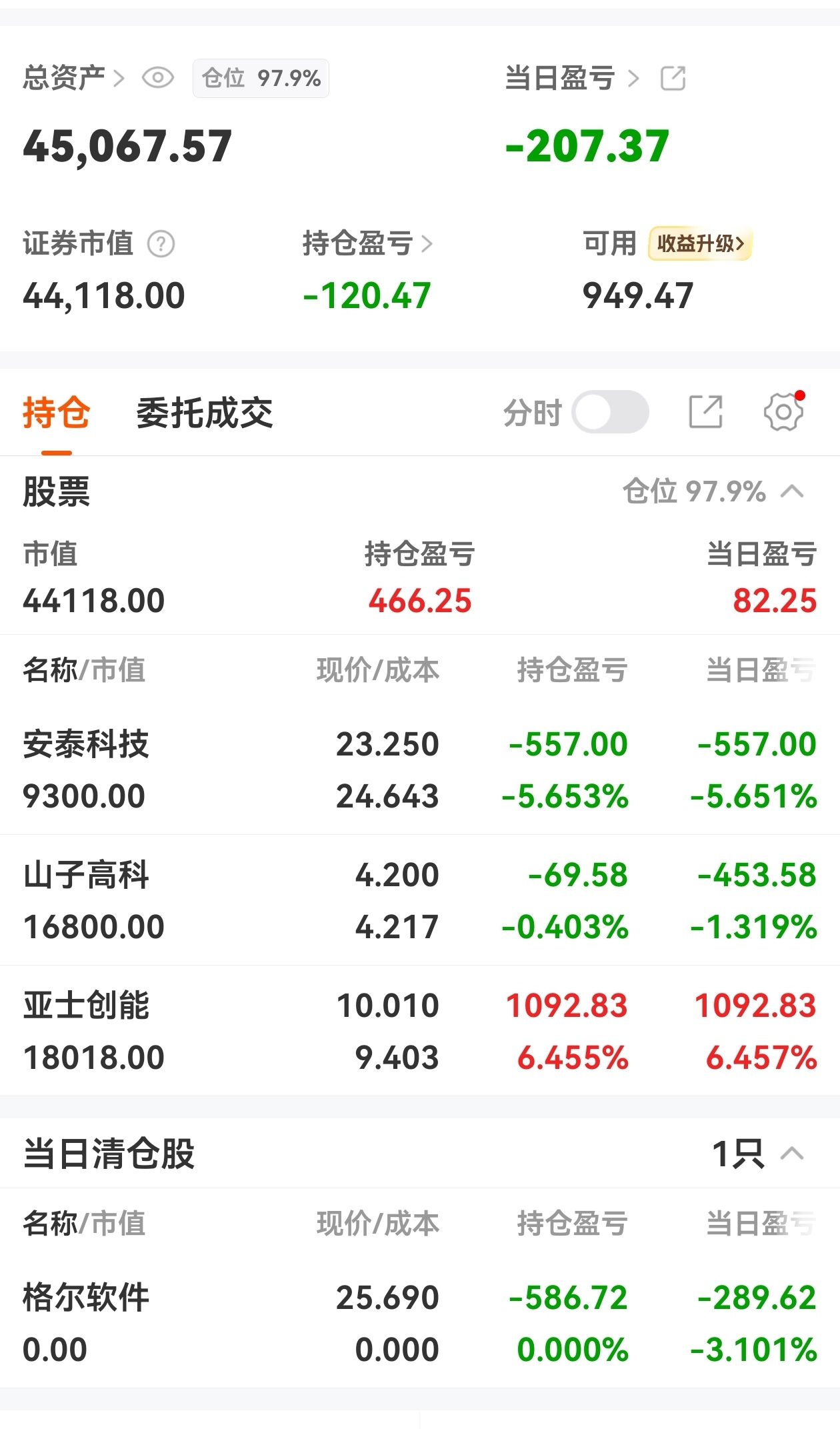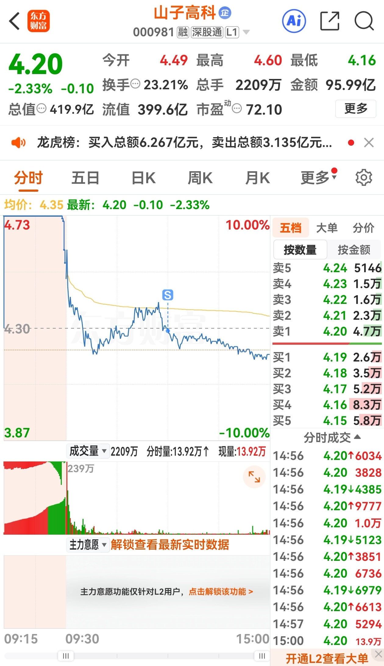 $山子高科(SZ000981)$ 冲高没走,感觉是在洗盘,上方4.99压力位,出了一半去吸了亚士