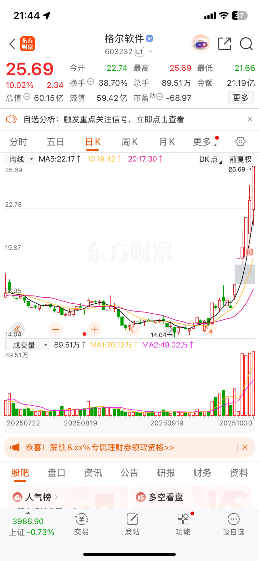$格尔软件(SH603232)$ 家人们,昨天高位买的,明早开盘就跑来得及吗?