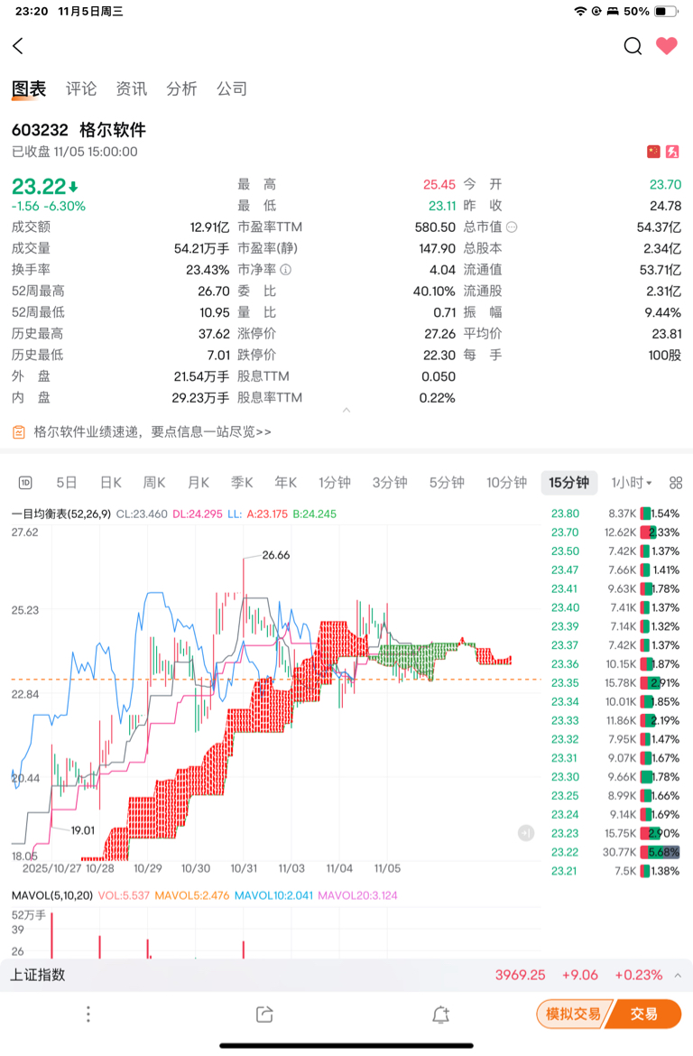$格尔软件(SH603232)$ k线今天刚进云层,还可以格局明天一天,明天突破不了阻力云层就得做减法了