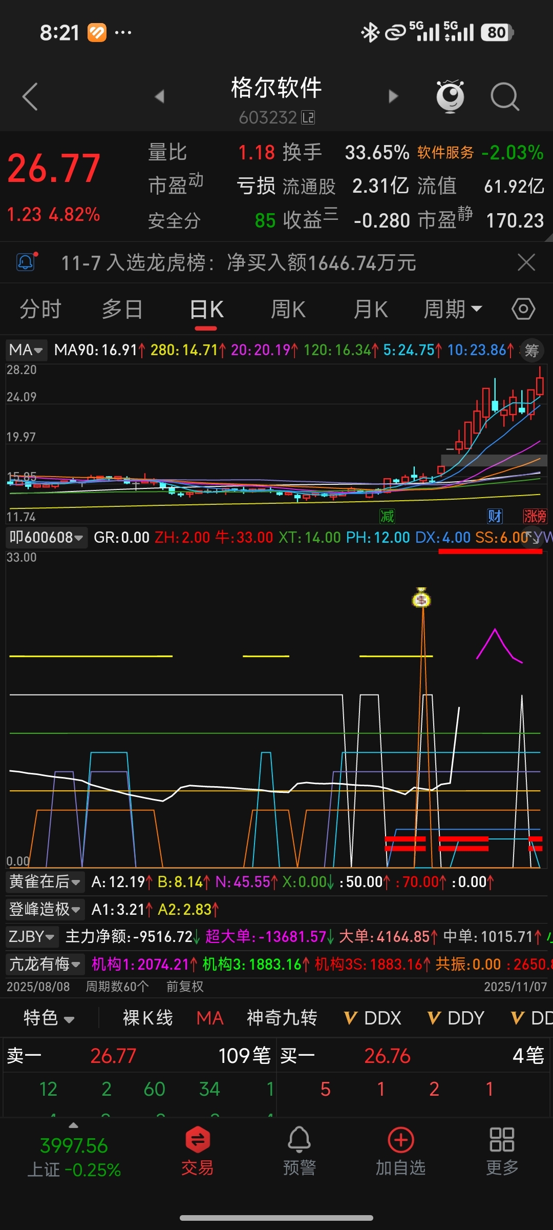 $格尔软件(SH603232)$ 5000票唯一之格尔软件,周五下跌2点时公式出票,犹豫了一下就拉上去了,看在公式票的份上追了点,收盘基本平。