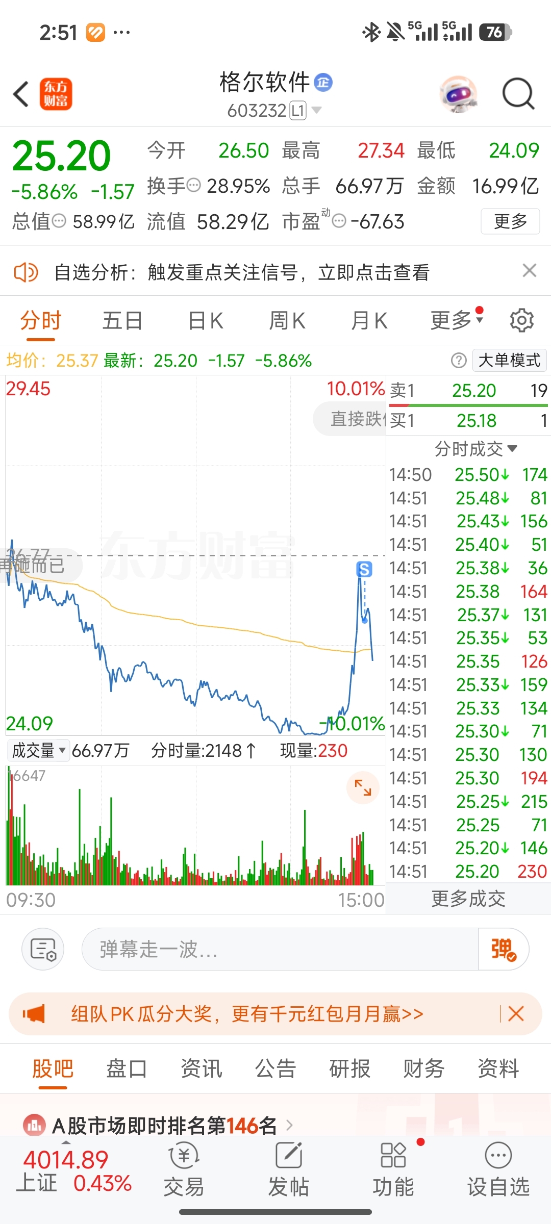 $格尔软件(SH603232)$ 格尔从跌停拉起,成本价附近直接走人。