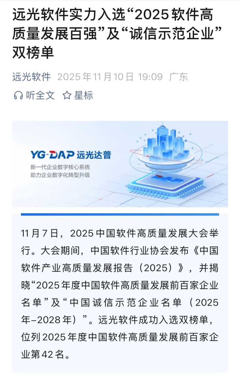 远光软件成功入选双榜单,成功位列2025年度中国软件高质量发展前百家企业:第42名。