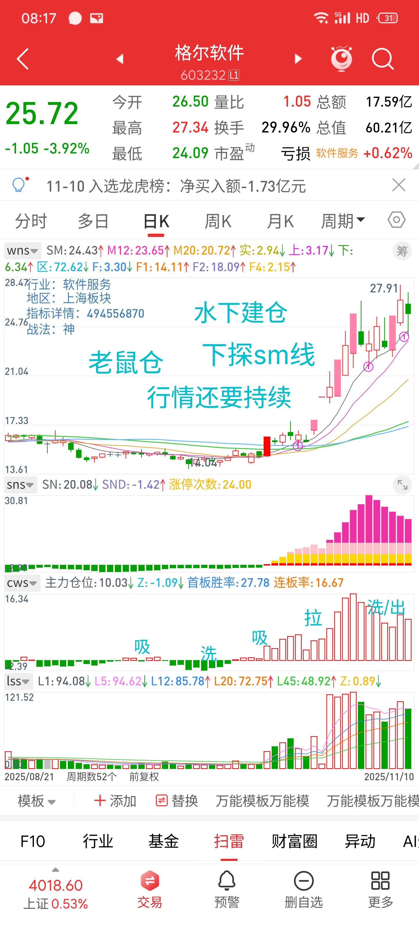 $格尔软件(SH603232)$ 昨天出了大长腿,回踩了sm处,今天应该是放量向上。这样走势才是完美的。今天如果缩量,股价波动不大,或者收十字星就是很好的机会。