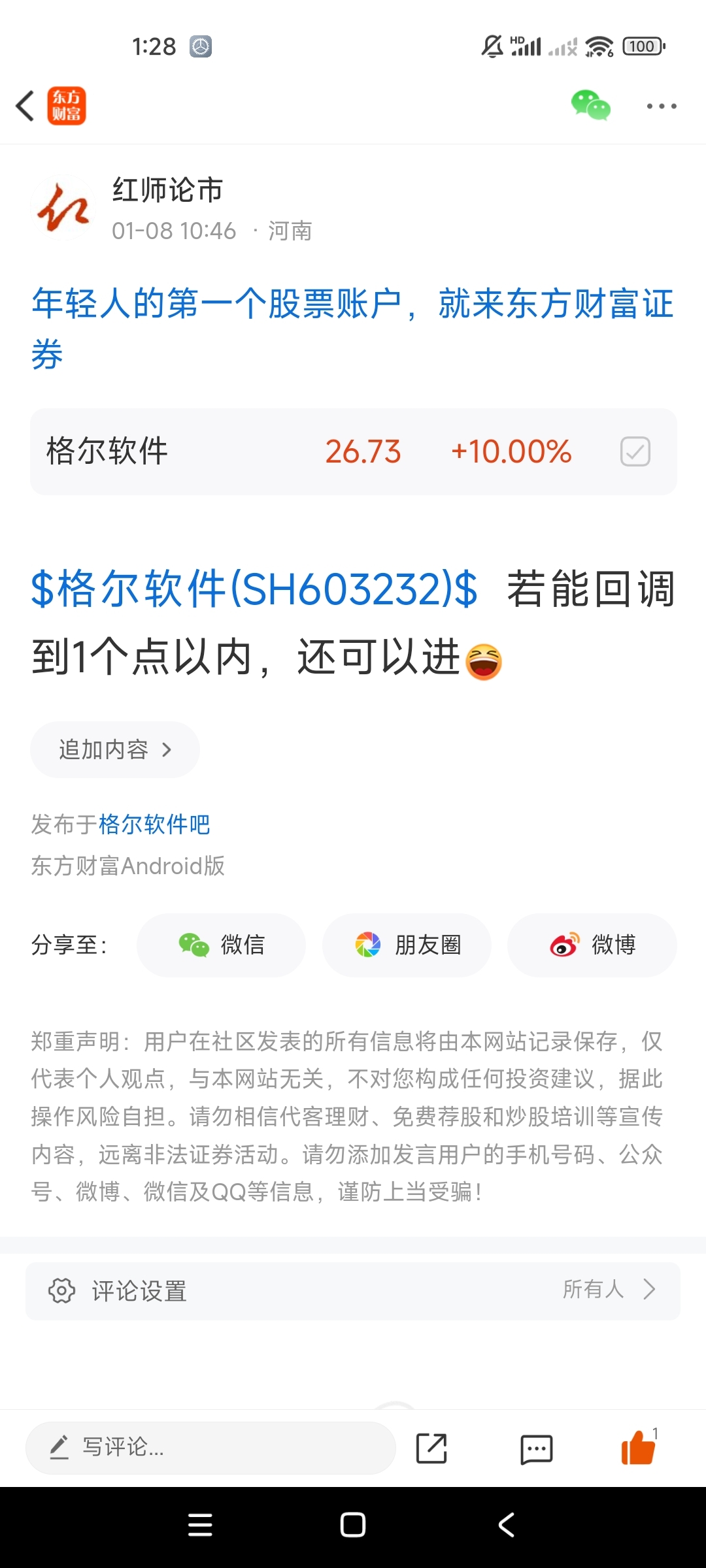 温馨提示: 1.根据《证券法》规定,禁止编造、传播虚假信息或者误导性信息,扰乱证券市场;2.用户在本社区发表的所有资料、言论等仅代表个人观点,与本网站立场无关,不对您构成任何投资建议。用户应基于自己的独立判断,自行决定证券投资并承担相应风险。《东方财富社区管理规定》