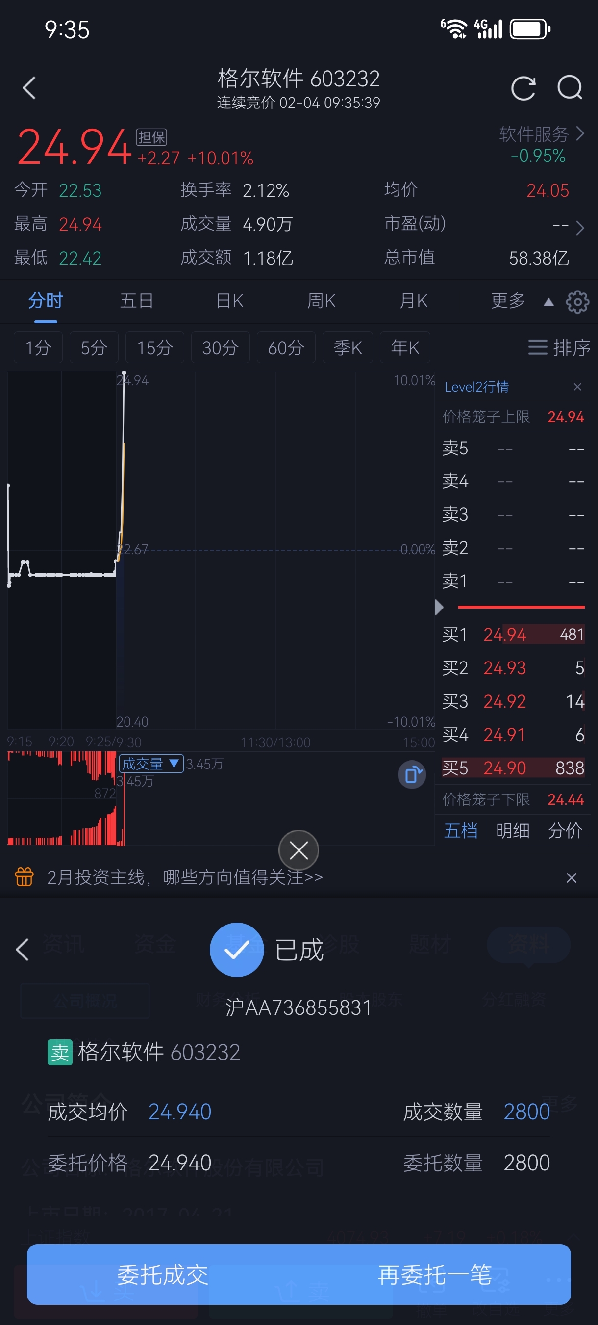 $格尔软件(SH603232)$  今天打板感觉不太好,全天几乎无量,明天如果拉高,主力也必然用来出货,如果回调也不会有承接力度