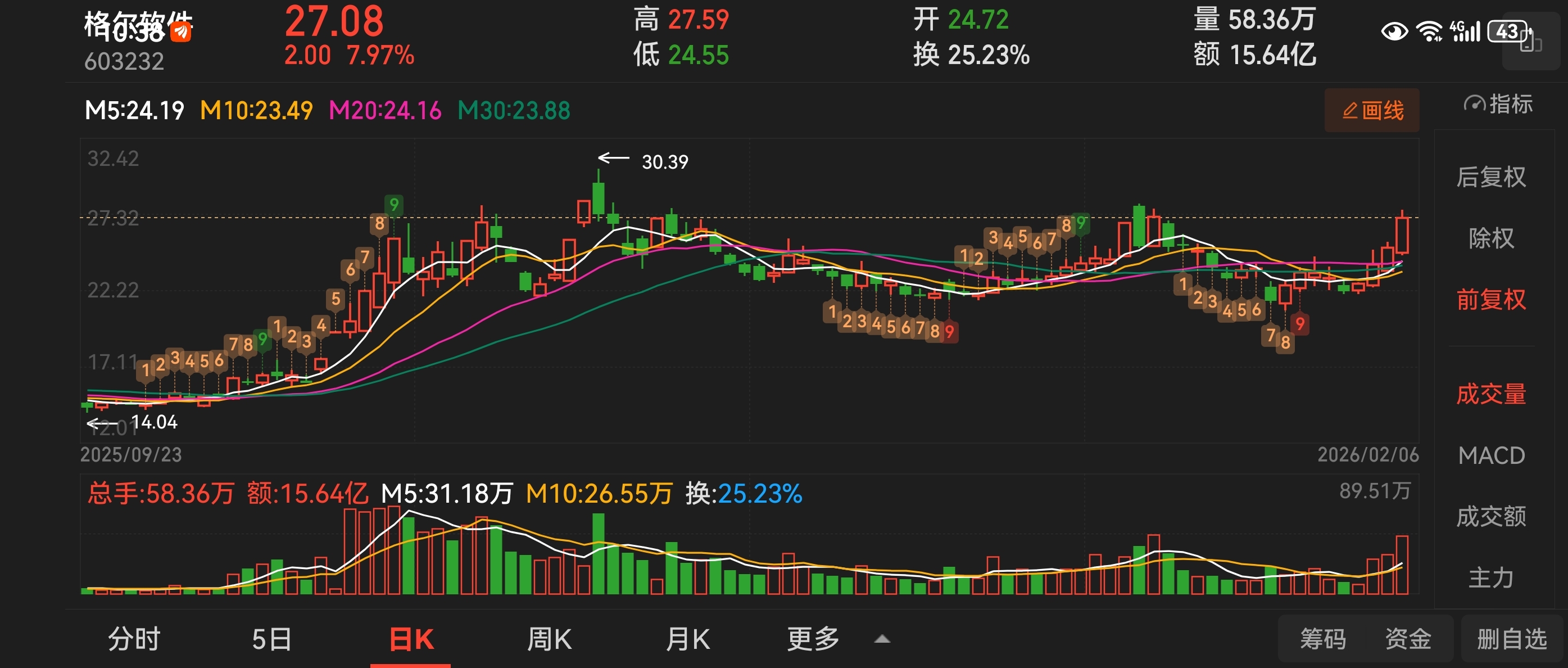 $格尔软件(SH603232)$ 给我先拉到三十附近