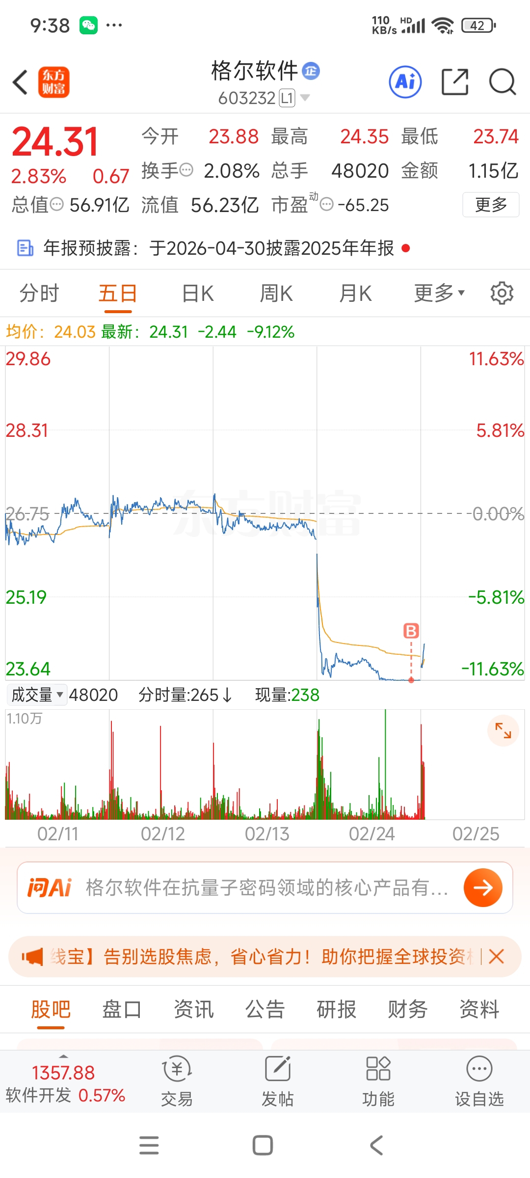 $格尔软件(SH603232)$ 大哥别拉了我跌停买的