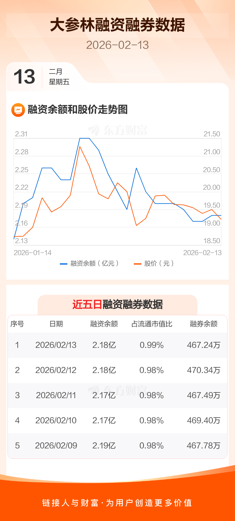交易所最新数据显示,大参林于2026年2月13日获融资买入593.59万元,融资偿还598.50万元,当日融资净偿还4.91万元。目前,该股融资余额2.18亿,占流通市值比例为0.99%。