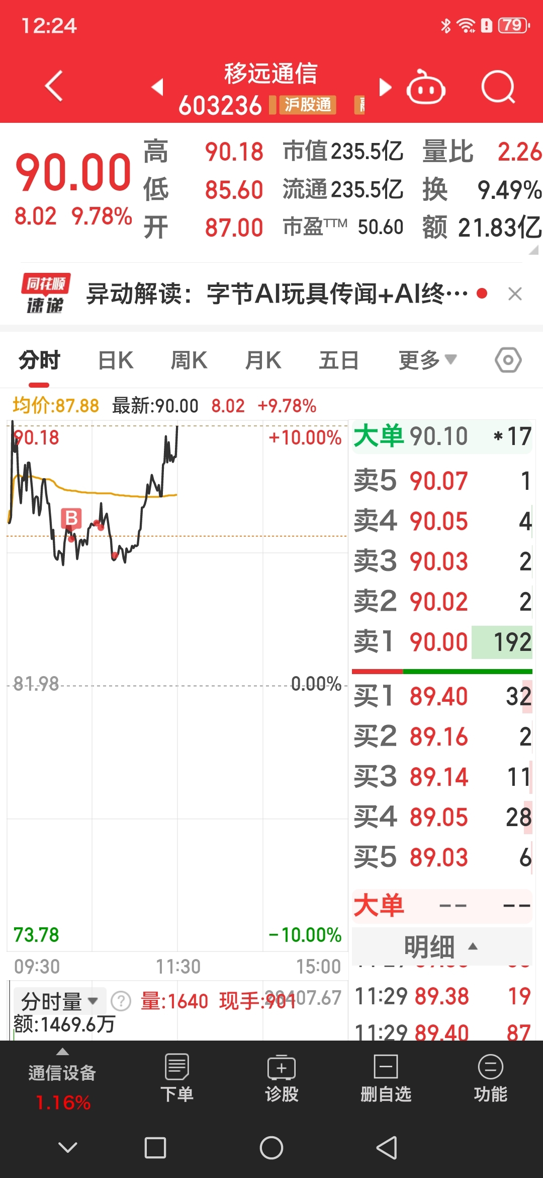 今天看到$天孚通信(SZ300394)$ 股东可以开始减持,真是怕了!在集合竞价115.74元止盈离场,86元-87元区间买入AI端侧四小龙之一$移远通信(SH603236)$ 。