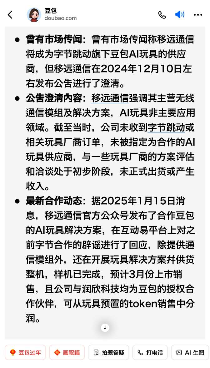 $移远通信(SH603236)$ 官方公众号近期已确认发布了合作豆包的AI玩具解决方案,在互动易平台上也回应称,除了向字节豆包提供芯片模组外,还在开展蜂窝通讯类玩具解决方案并供货整机,样机已完成,预计3月份上市销售,目前公司已成为豆包的授权合作伙伴,可从AI玩具预置的Token销售中抽取利润分成。也就是说如果新推出的这款豆包陪伴教育类AI玩具一旦成为爆款,只要用户充值成功,移远就可以和IP厂商一起从中利润分成。所以除了今天发布了超预期的年报预计增长495.33%外,2025年公司一季报必定会更加爆发式增长,股价再创历史新高将在2月份完成。