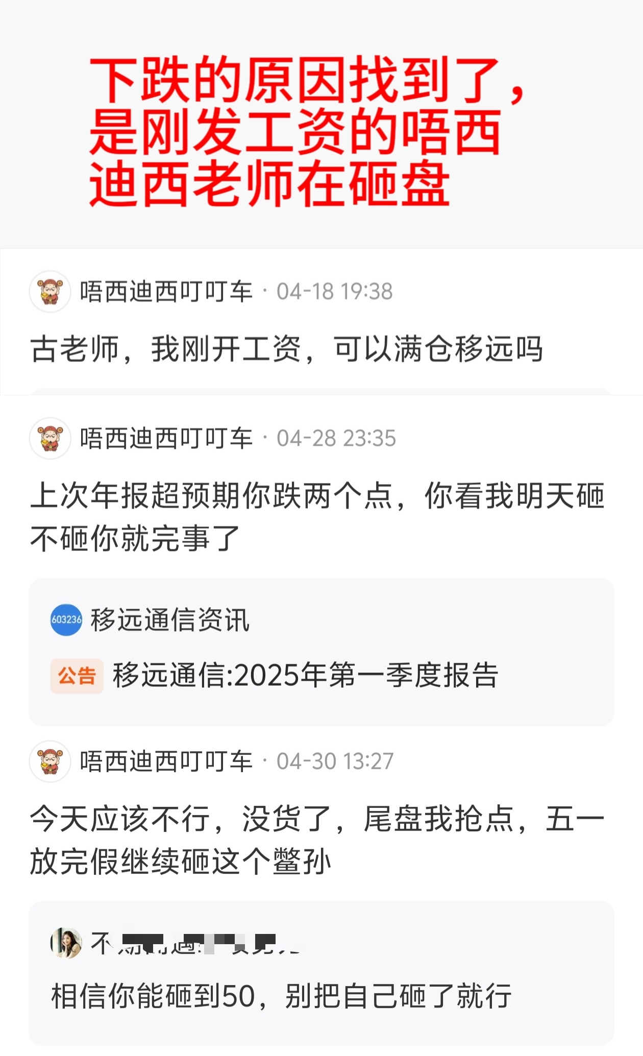 $移远通信(SH603236)$ 下跌的原因找到了,是刚发工资的唔西迪西老师在砸盘@唔西迪西叮叮车