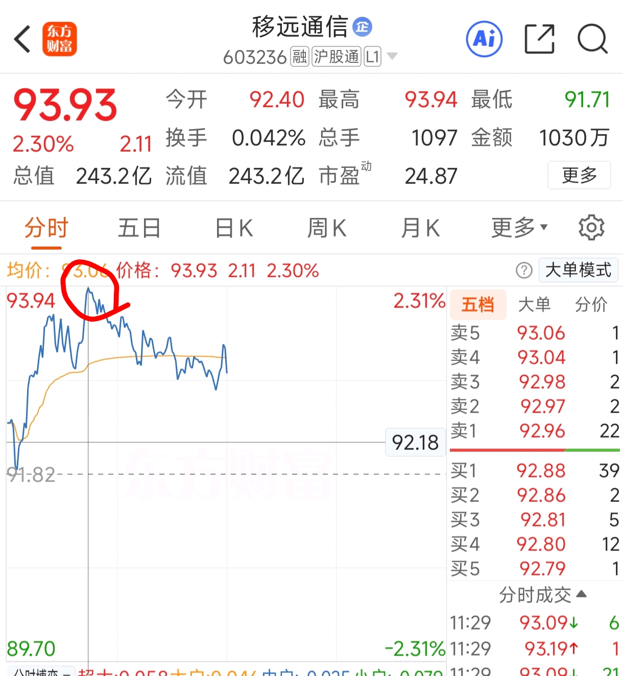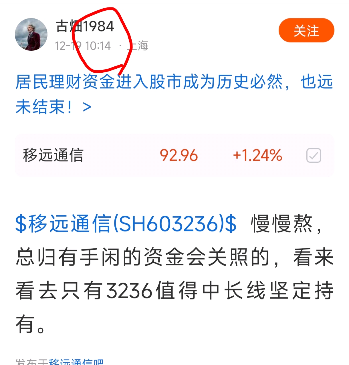 移远通信在10点14分冲高,然后古鳌兴奋了发帖说看来看去只有移远值得中长线持有,