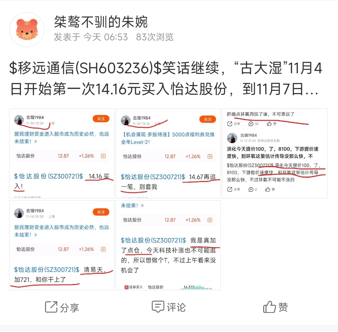 $移远通信(SH603236)$ 朱婉老师,你好,哈哈,你也得看下当时大盘背景,11.4-11.25,那一段时间科技股跌成鬼一样了,怡达虽然没有跟随锂电暴涨,至少走了一个上升波段,很适合高抛低吸呢,我可怜的3236那时候单边下跌从94跌到82.5,所以不得找个小三过渡一下么,别笑我,总比那时候你用另外个号不停的唱衰3236好吧