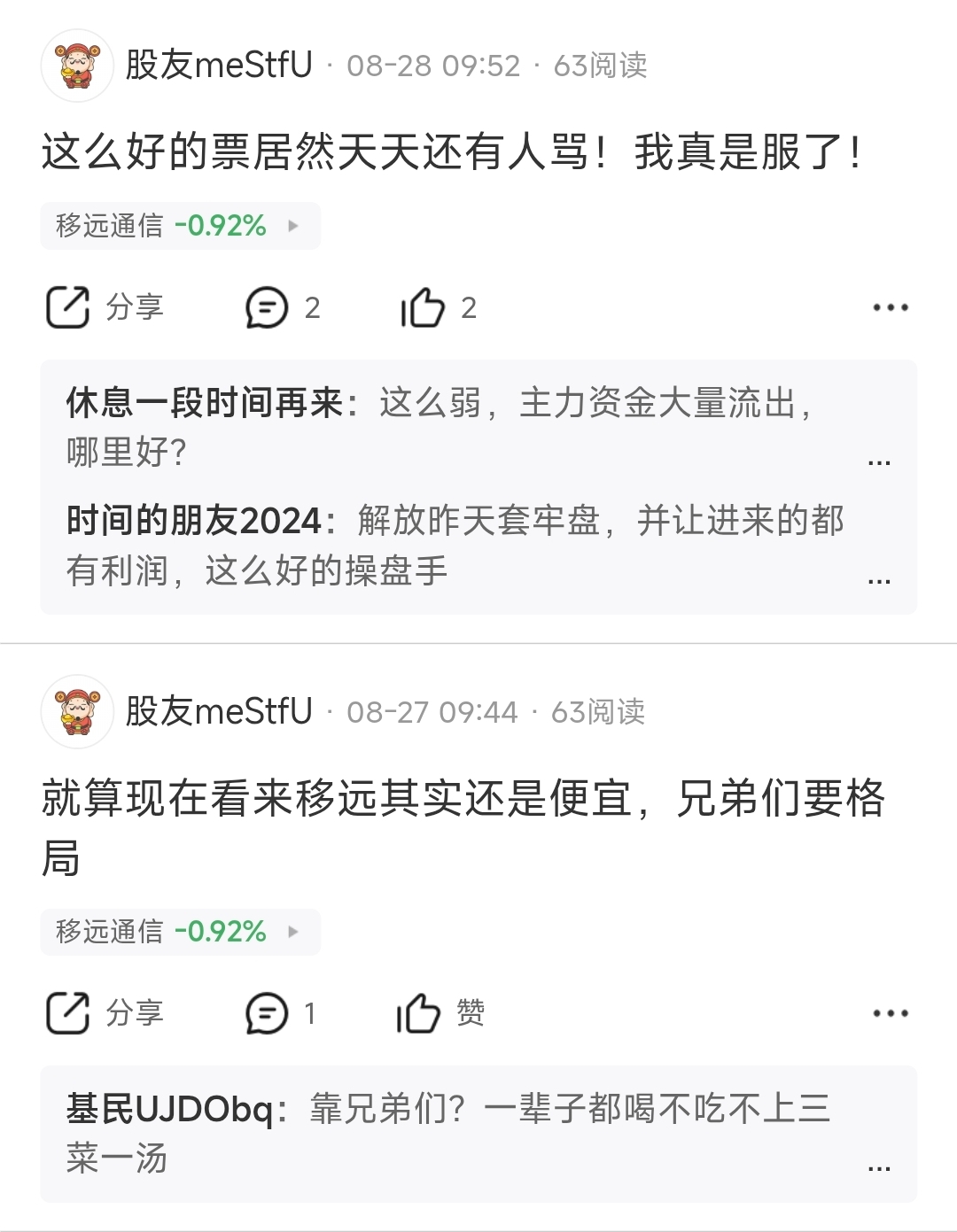 $移远通信(SH603236)$ 哥们要看清形势,移远高位是几乎是很多科技股的高位,你在这个时候满仓满融,你应该反省自己,这是其一,移远高位之前你买的其他科技股一样是冲顶趋势,你不可能没有吃肉,就好比移远也是从80涨到113的,现在只不过利润回踩这是其二,如果第二不成立,你更应该反省自己,8.29号移远最高点之前,你自己的买卖是不是有问题