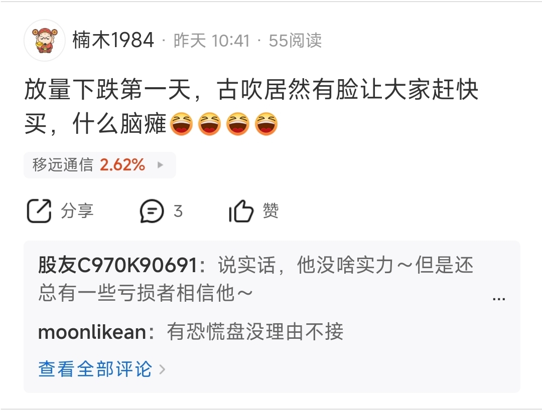温馨提示: 1.根据《证券法》规定,禁止编造、传播虚假信息或者误导性信息,扰乱证券市场;2.用户在本社区发表的所有资料、言论等仅代表个人观点,与本网站立场无关,不对您构成任何投资建议。用户应基于自己的独立判断,自行决定证券投资并承担相应风险。《东方财富社区管理规定》